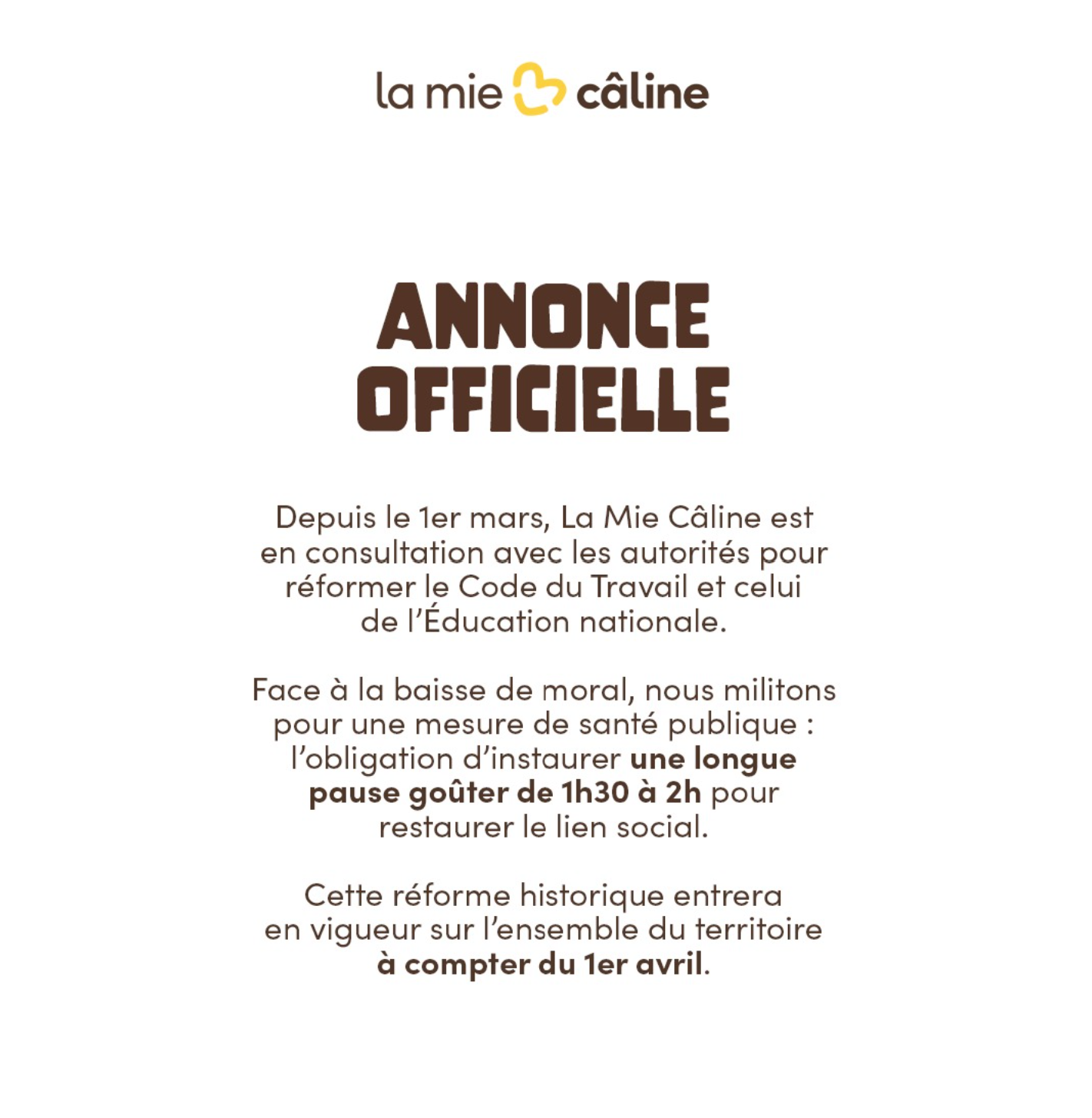 À côté de ces marques installées, certaines enseignes plus challengers tirent aussi leur épingle du jeu en jouant sur un ton encore plus affirmé. C’est le cas de La Mie Câline, qui a imaginé une “pause goûter obligatoire” de 1h30 à 2h, présentée comme une quasi-réforme de santé publique.